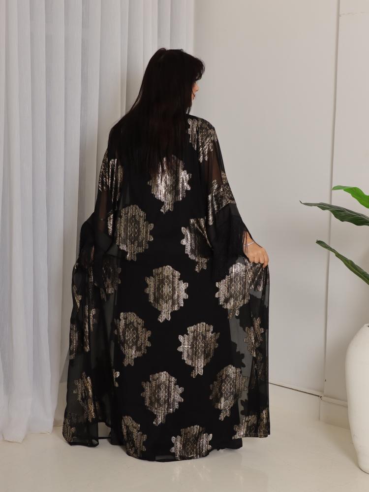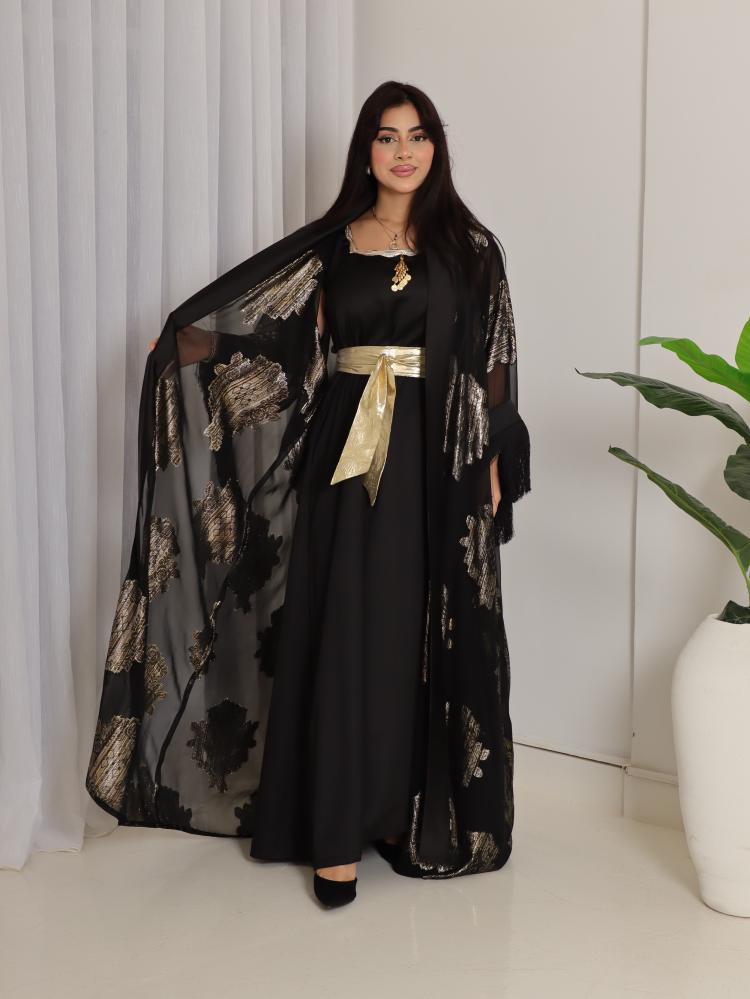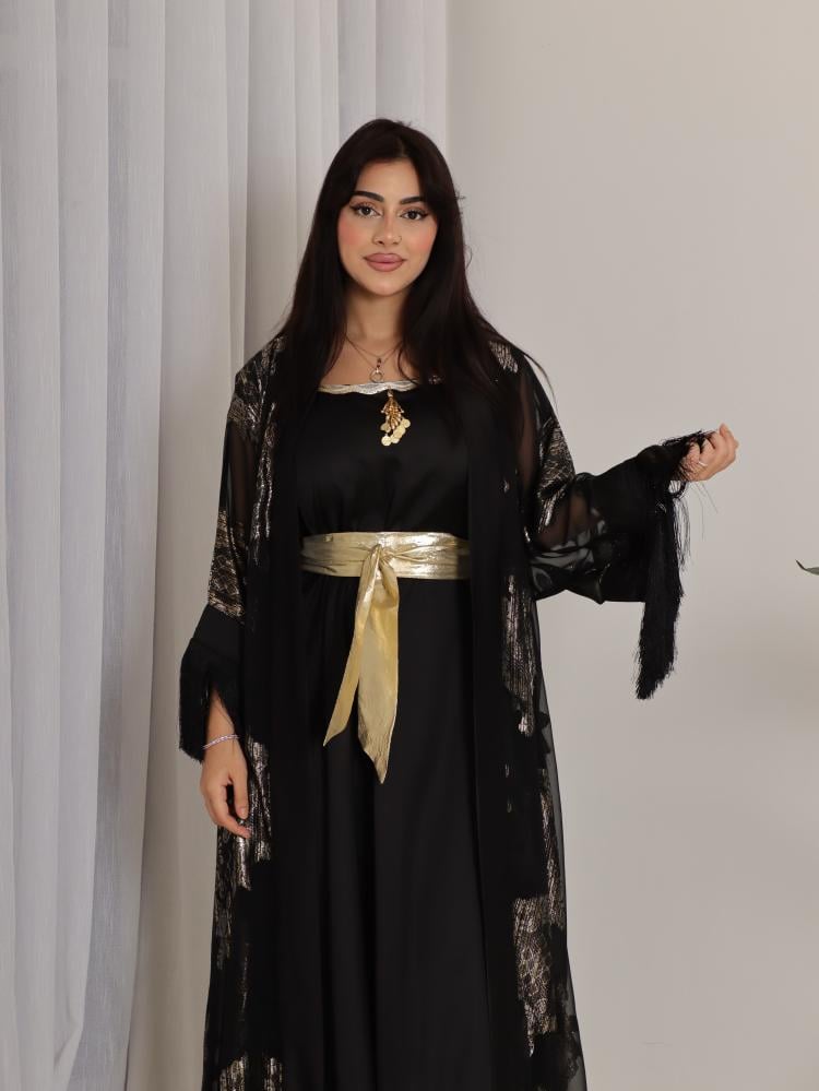 تألقي بإطلالة راقية مع جلابية الأسود والذهبي، حيث يلتقي الأسود ملك الألوان مع لمسات الذهب الفاخرة. تتكون من قطعة داخلية أنيقة مصنوعة من كريب ستان الناعم، وتعلوها عباية خارجية من الشيفون المقصب بتصميم نصف كلوش يمنحك انسيابية وجاذبية لا مثيل لها. تزين الأكمام أطراف الهدب لمظهر أكثر تميزًا وأناقة.