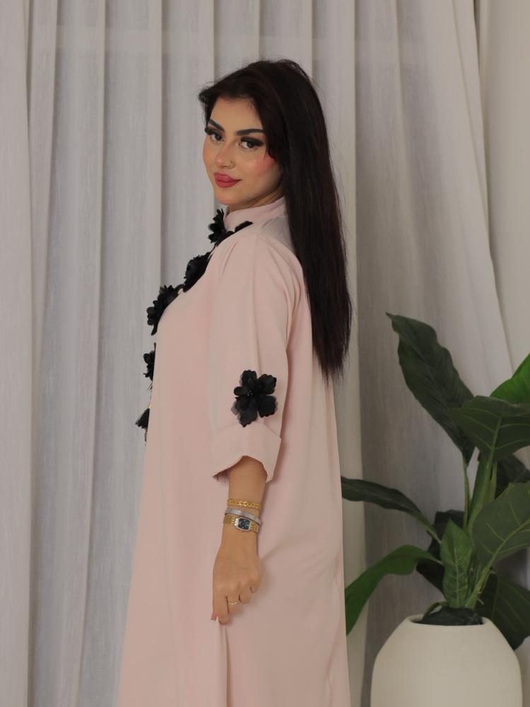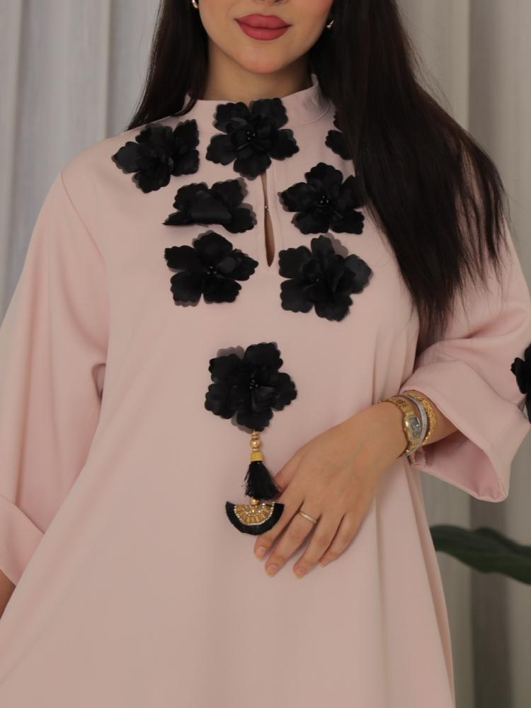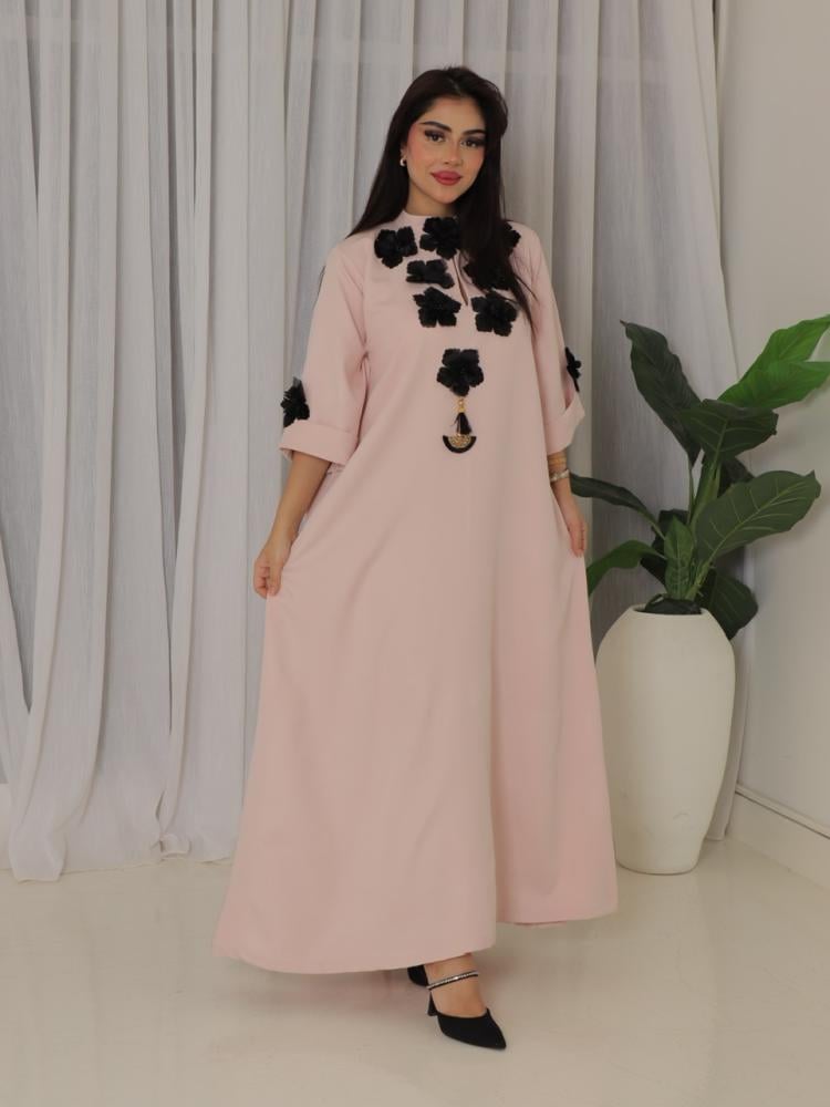 تألقي بأناقة لا مثيل لها مع جلابية الكريب بلون زهري ، مثالية لجميع مناسباتك الخاصة. تتميز الجلابية بتصميم طويل بقصة كلوش تمنحك انسيابية راقية وجاذبية، مع تفاصيل الورد السودا التي تزين الأطراف في الكم والرقبة لإضفاء لمسة من الفخامة. الأكمام الواسعة تضيف لمسة من الراحة والأناقة في آن واحد.