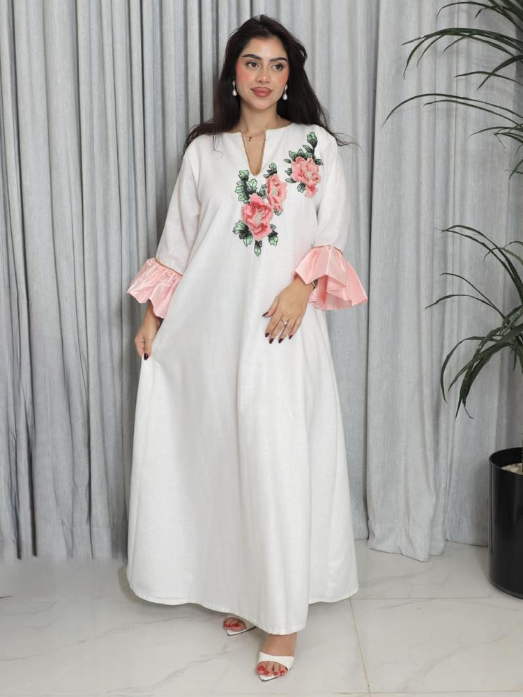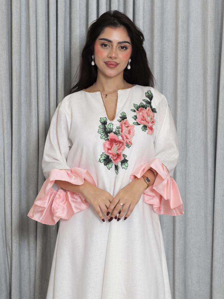 تألقي بأناقة لا مثيل لها مع جلابية اللينن بلون الابيض ، مثالية لجميع مناسباتك الخاصة. تتميز الجلابية بتصميم طويل بقصة كلوش تمنحك انسيابية راقية وجاذبية، مع تفاصيل الورد الوردي التي تزين الصدر ة لإضفاء لمسة من الفخامة. الأكمام الواسعة في الاطراف كشكشة من الاورقنزا الوردي تضيف لمسة من الراحة والأناقة في آن واحد.